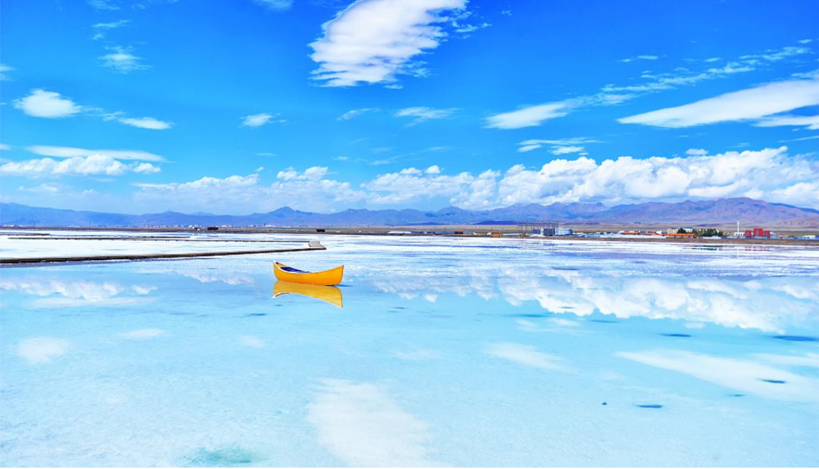 茶卡鹽湖是一座有三千多年歷史的鹽場,湖水含鹽量很大,會自然結晶成為一片白色的湖面,將天空、云朵和對岸的山都倒映在湖