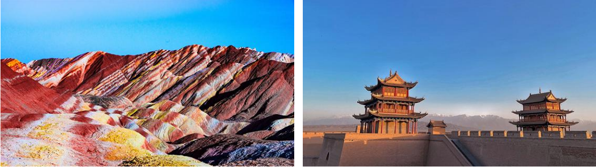早餐后參觀【張掖七彩丹霞地貌】(含區(qū)間車)(游覽約 2 小時),這里是我國丹霞地貌景觀中色彩最鮮亮、地貌造型最豐富的地區(qū)之一。被《中國國家地理》雜志評為中國最美的七大丹霞地貌之一;色如渥丹,燦若明霞的張掖丹霞像火焰般炙熱,又有一股橙色的熱情和明亮,它獨特的地貌,縱橫交錯,錯落高低,起伏舒展,迷宮一樣的峽谷,褶皺層巒的巖層和絢麗彩色融為一體的山巒,目不暇接,七彩丹霞一共六個觀景臺,坐電瓶車可觀賞不同的丹霞形態(tài),七彩屏,大扇貝,刀山火海等,4 號觀景臺是最佳的看日落之地,張藝謀的《三槍拍案驚奇》在此取過景。乘車前往嘉峪關(260KM,約 3 小時)。參觀【嘉峪關城樓】(游覽約 2 小時) 嘉峪關關城在嘉峪關市區(qū)西南 6 公里處,位于嘉峪關最狹窄的山谷中部,地勢最高的嘉峪山上,城關兩翼的城墻橫穿沙漠戈壁,向北 8 公里連黑山懸壁長城,向南 7 公里,接天下第一墩,是明代萬里長城西端主宰,自古為河西第一隘口。晚住嘉峪關。晚上【大唐美食街】,品嘗當?shù)孛朗场<斡P的飲食可謂百味薈萃。在這里,全國各地的名小吃,都能吃到,本地的烤肉,更是不可錯過哦,烤肉的全面性,豐富到你想不到……