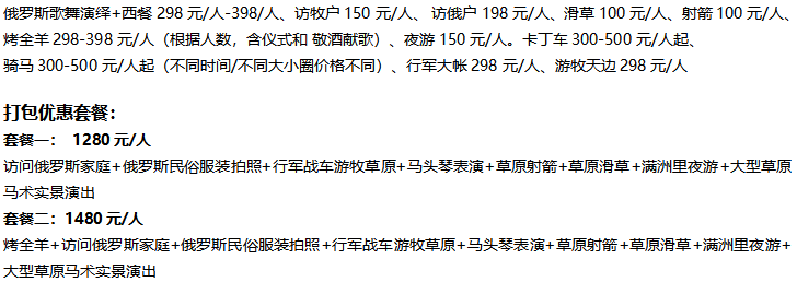 5、嬰兒費用(2 周歲以下):不占座位、不含景點門票、不含當?shù)芈糜诬囄弧⑷滩徽即参弧⒉惶峁┰绮图安唾M。儀含旅行社責任險費用,嬰兒出游需提前與我社銷售溝通,敬請留意自費項目參考內容:俄羅斯歌舞演繹+西餐 298 元/人-398/人、訪牧戶 150 元/人、訪俄戶 198 元/人、滑草 100 元/人、射箭 100 元/人、夜游 150 元/人。卡丁車 300-500 元/人起烤全羊 298-398 元/人 (根據(jù)人數(shù),含儀式和 敬酒獻歌)騎馬 300-500 元/人起 (不同時間/不同大小圈價格不同)、行軍大帳 298 元/人、游牧天邊 298 元/人。