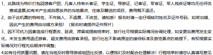 特殊說明:行程景點門票均為旅行社統(tǒng)一采購價,且經旅游局批準已進行旅游團隊系統(tǒng)的優(yōu)惠,故對所有證件(學生證、教師證、軍官證、老年證、殘疾證等證件)均不在享受任何優(yōu)惠政策,其優(yōu)惠價格不予退還。贈送項目及景點如因個人原因或不可抗力因素或天氣原因無法參觀游覽,門票費用不退,不置換,敬請諒解!