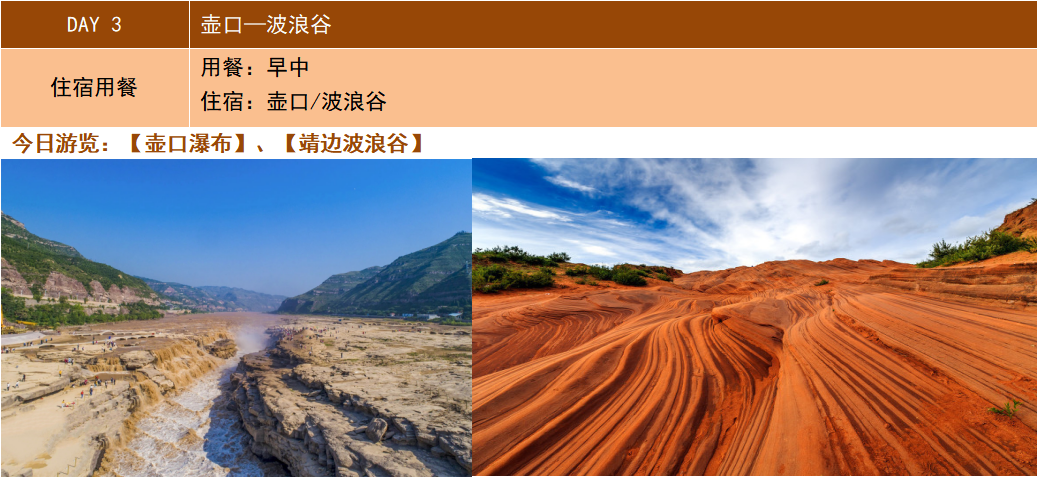 早餐后赴【壺口瀑布】(游覽時間約1.5H,電瓶車40/人自理)世界級的地質(zhì)奇觀十里龍槽,柯受良、朱朝輝飛黃標(biāo)志,孟門山等,欣賞晉陜峽谷奇特風(fēng)光,感受黃河母親的神秘氣息!近觀氣勢磅礴的黃河風(fēng)采,感受“天下黃河一壺收”。之后前往靖邊參觀游覽時間的紋路、上帝的指紋中國【靖邊波浪谷】(玻璃橋50元自理)(游覽時間約2-3H)近距離的感受丹霞地貌的魅力,由于地殼上升、巖石被流水切割侵蝕、山坡崩塌后才有了今天這鬼斧神工的美景,再次自由參觀拍照后,波浪谷展示的是由數(shù)百萬年的風(fēng)、水和時間雕琢砂巖而成的奇妙世界。波浪谷巖石的復(fù)雜層面,是由一億五千萬前侏羅紀(jì)就開始沉積的巨大沙丘組成。沙丘不斷地被一層層浸漬了地下水的紅沙所覆蓋,天長日久,水中的礦物質(zhì)把沙凝結(jié)成了砂巖,形成了層疊狀的結(jié)構(gòu)。后前往波浪谷安排酒店入住休息。