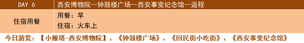 早餐后,游覽【小雁塔-西安博物院】(參觀約2小時),(每周二閉館一天)西安博物院在國內(nèi)博物館(院)中獨(dú)樹一幟,以千年古塔園林式遺跡休閑景區(qū)以及古都西安現(xiàn)代型歷史博物館而聞名。小雁塔即“薦福寺塔”,位于西安城南薦福寺內(nèi),與大雁塔相距三公里。因低于大雁塔,故稱“小雁塔”,小雁塔在漫長的歲月里,經(jīng)受了1200多年風(fēng)雨的侵襲和70余次地震的考驗依然屹立不倒,令人嘆服古代能工巧匠高超的建筑技藝,近距離的觸摸這千年古剎。中餐后參觀我國目前規(guī)模最大,建筑最宏偉,保存最完整的明代建筑之一【鐘鼓樓廣場】(約1小時)細(xì)細(xì)品味古長安八景之一“晨鐘暮鼓”的古老和悠遠(yuǎn);然后赴與鐘鼓樓近在咫尺的回民小吃一條街,品嘗特色小吃,后前往前往位于西安市建國路60號的西安事變紀(jì)念館(游覽約1小時),由三座磚木結(jié)構(gòu)的西式樓房構(gòu)成主體建筑,是震驚中外的西安事變發(fā)生地。后根據(jù)火車時間送往西安站,結(jié)束愉快的旅程!
