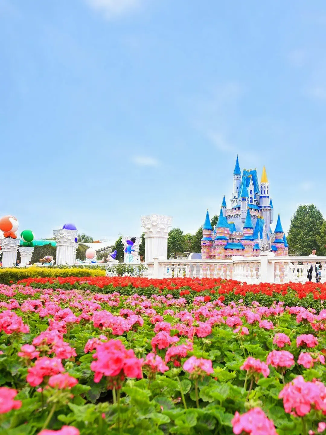 三座粉、藍相間的巨型迪斯尼風格門樓,一片橙色的仙女花在陽光恬靜地流敞著。七個巨型的氣球“串”綻放繽紛色彩,邊上還圍著精美的花柱。香格里拉,正如其名,有著一種永恒、和平、寧靜的 “世外桃源”。